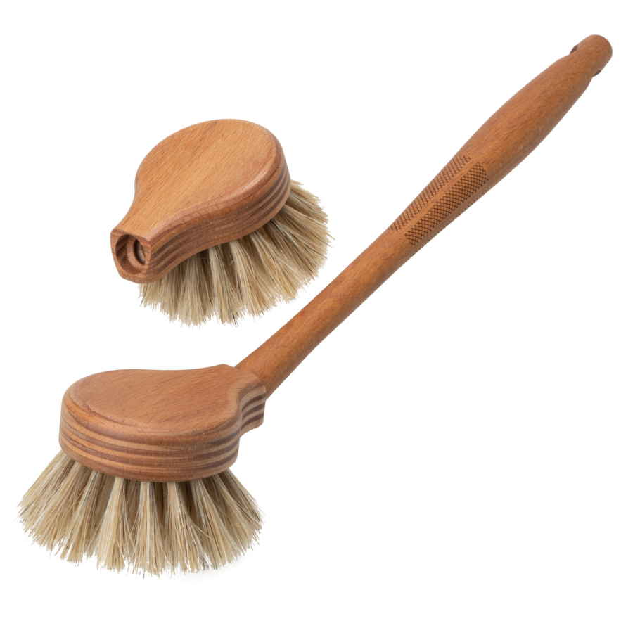 Gullfallegur uppþvottabursti með útskornu handfangi, olíuborið beyki. Ljós og mjúk hrosshár. Hausinn er með skrúfgang þannig að skaftið skrúfast í hausinn.