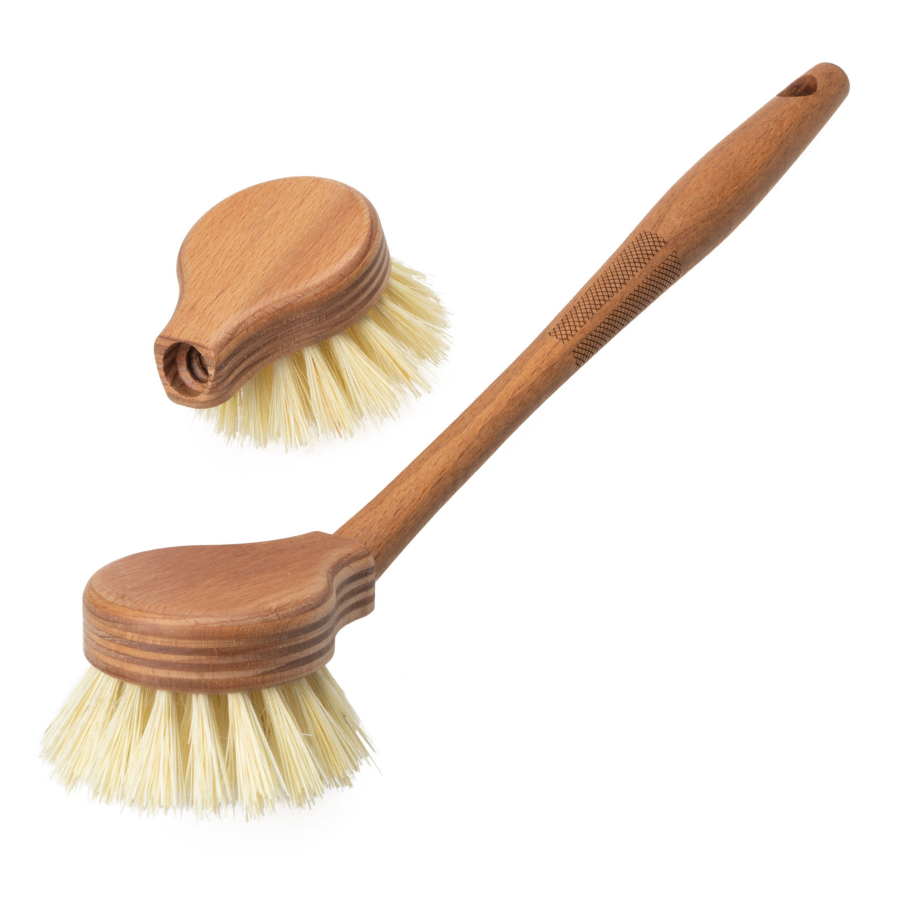 Gullfallegur uppþvottabursti með útskornu handfangi, olíuborið beyki. Ljós burstahár úr tampíkó náttúrulegum trefjum. Hausinn er með skrúfgang þannig að skaftið skrúfast í hausinn.